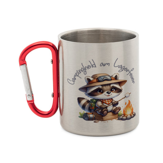 "Campingheld am Lagerfeuer" - Edelstahl-Tasse für Kinder mit Karabiner - beidseitig bedruckt - Rechts- & Linkshänder