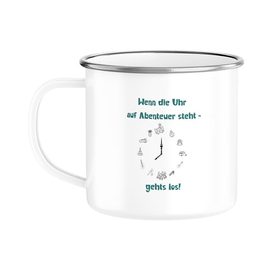 "Uhr steht auf Abenteuer" - Kinder Emaille Tasse- beidseitig bedruckt - Rechts- & Linkshänder